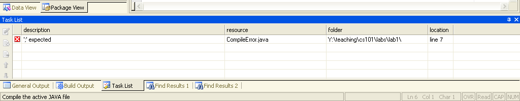 Put a copy of CompileError.java in your Home Directory folder. Load it up into JCreator, and compile it. It will show a compile error when you do so, as shown below. Do not fix this bug yet!